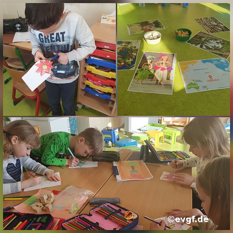 Dabei entstanden Blumenkränze, welche durch die Blumen jedes einzelnen Kindes ganz individuell gestaltet wurden. Auch kleine Naschereien von den Cook Inseln konnten die Kinder in Form von Bananen und Kokosnüssen probieren. Am Ende entstand ein buntes Blumenmeer.