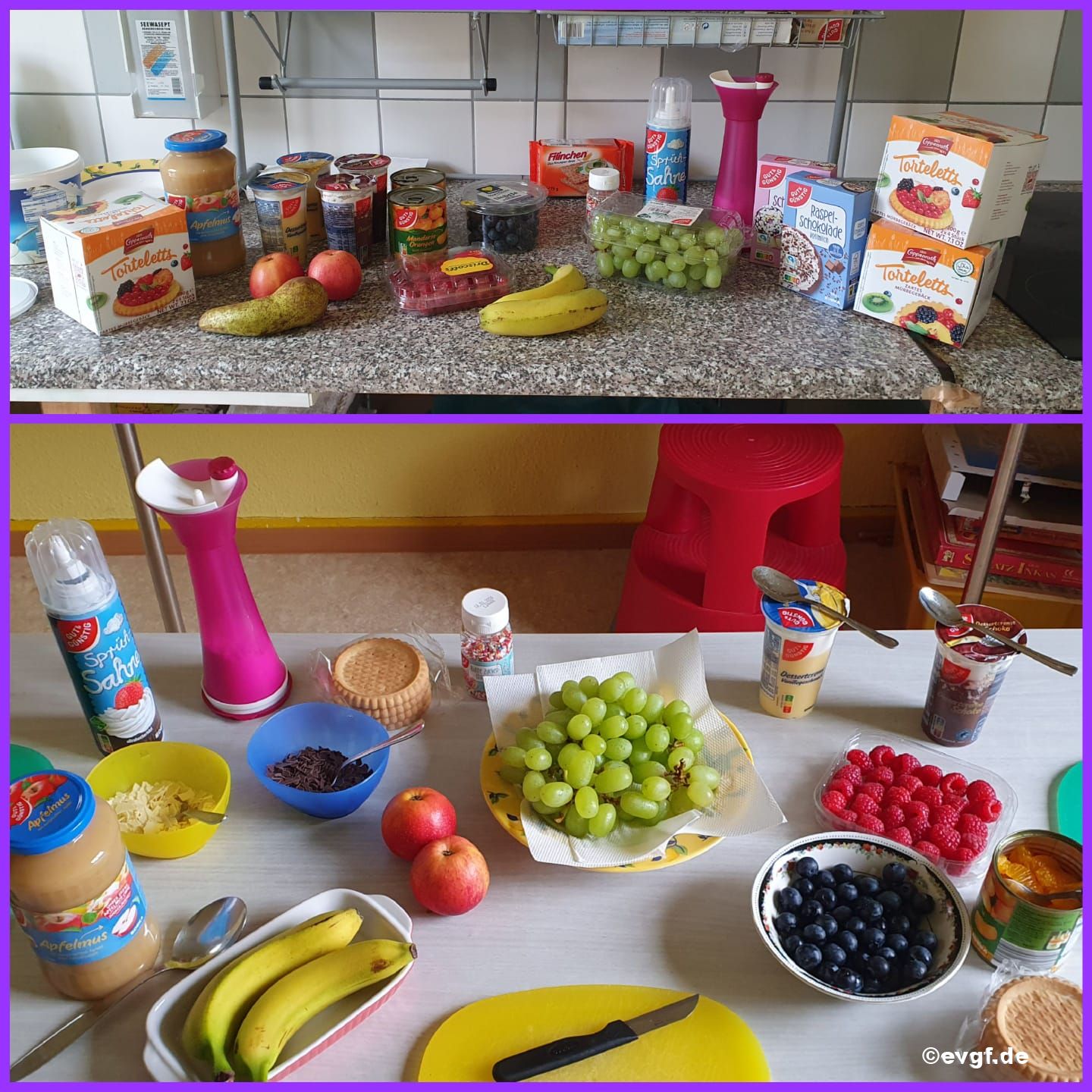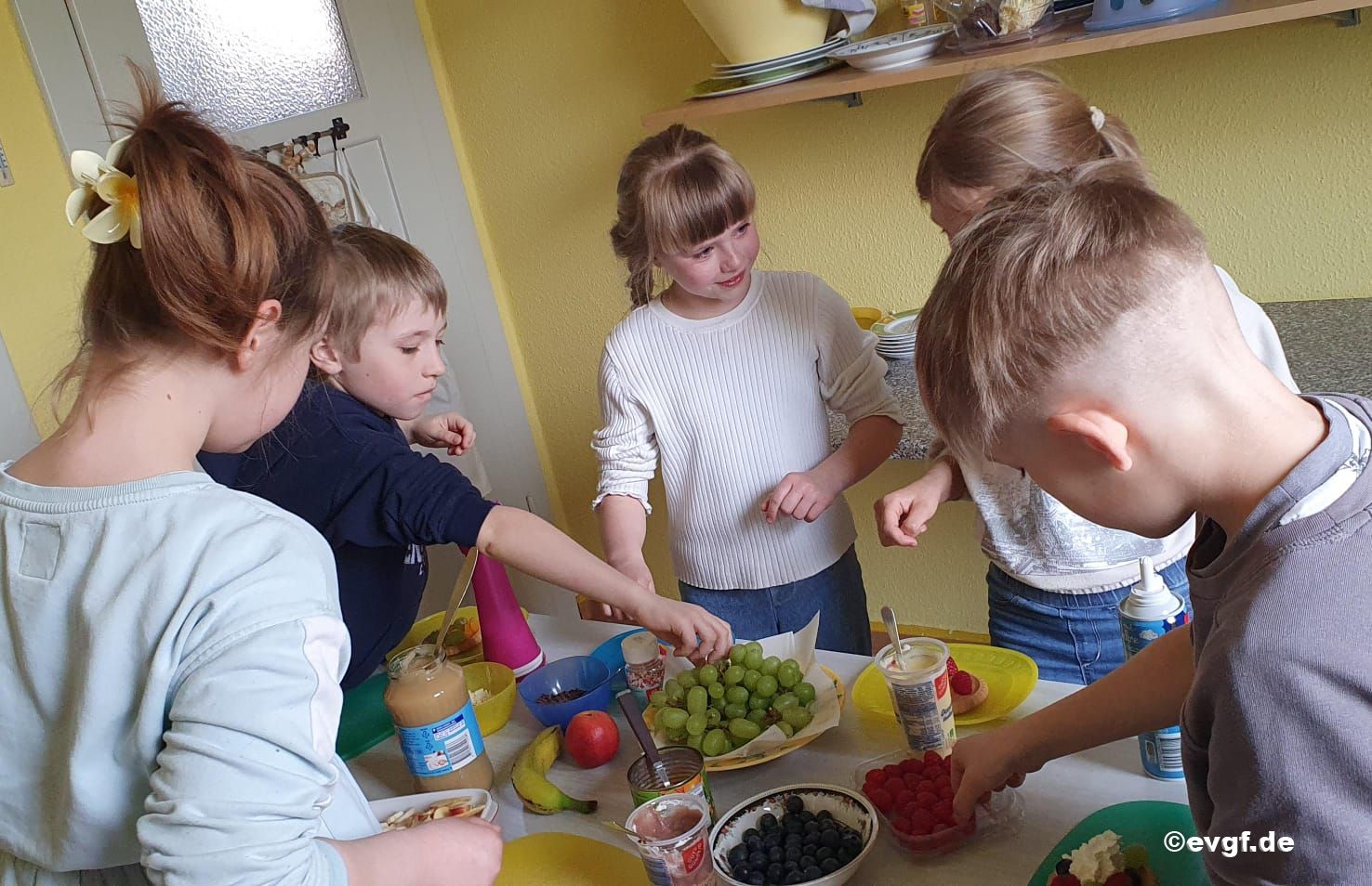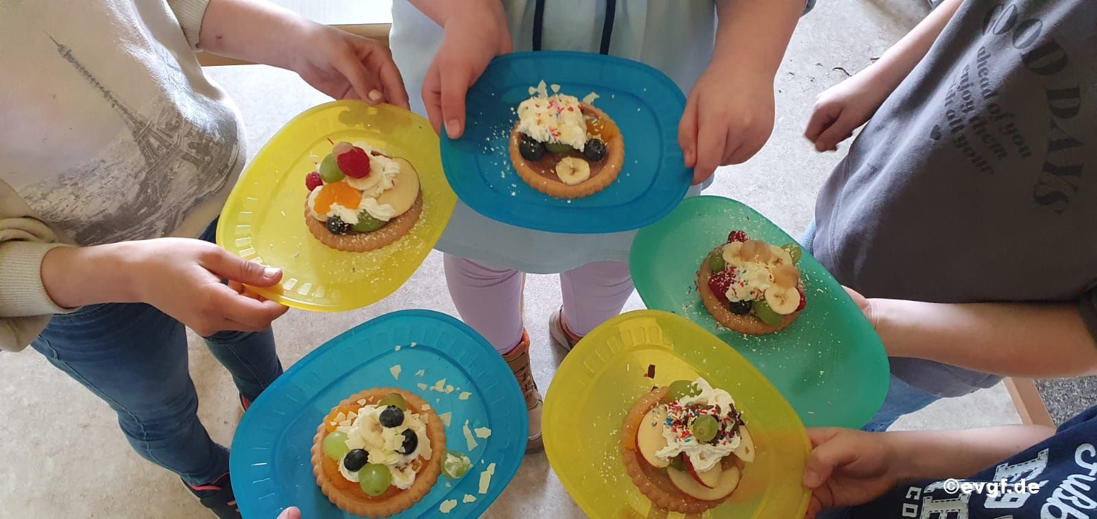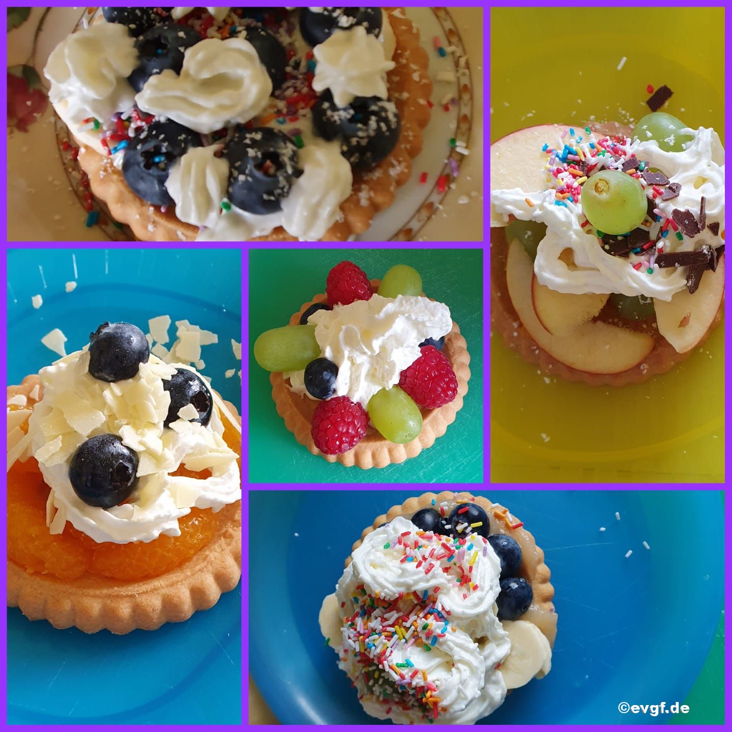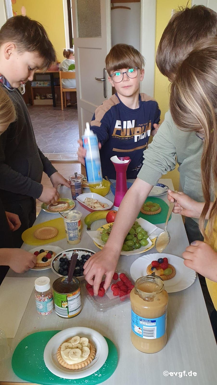 Der "süße" Gruppennachmittag der Klasse 3 am 9. April 25 wurde sehr gut angenommen. Die Kinder belegten ihre Törtchen mit frischem Obst, Pudding, Apfelmus, Schlagsahne und anderen köstlichen Dingen.