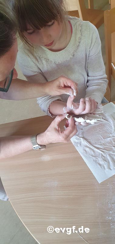 Konzentration und Geschick waren wichtig. Wir haben gelernt, dass sich Gips erwärmt, bevor er vollständig ausgehärtet ist. Die Hände trocknen jetzt erst einmal, bevor sie dann zum nächsten GN "Mein Körper" kreativ gestaltet werden können.
