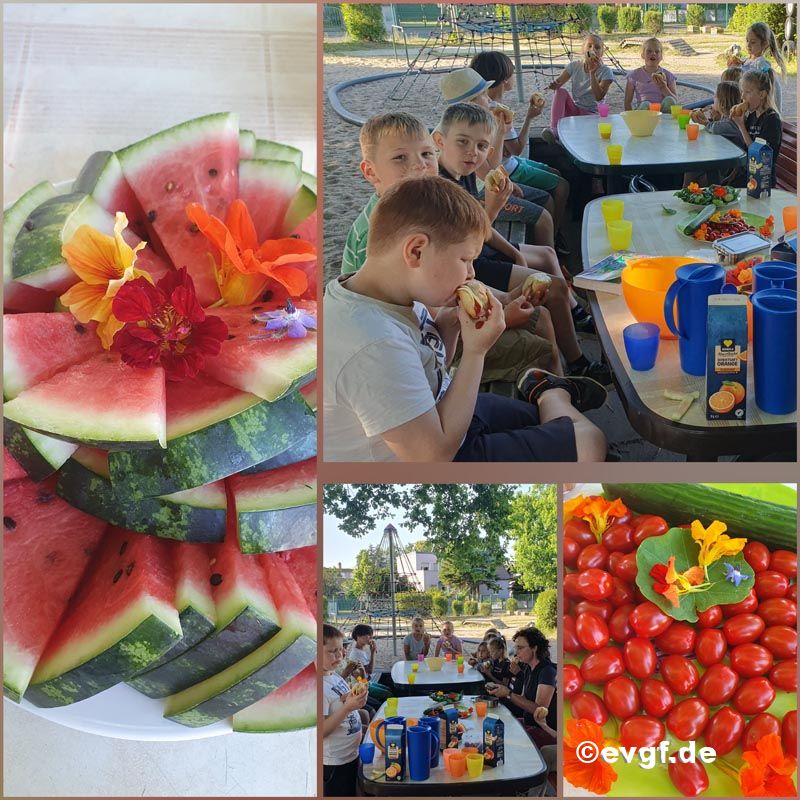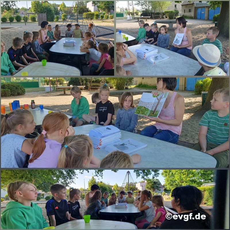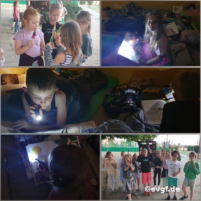 Nach dem anschließenden Abendessen bereiteten die Kinder ihr persönliches Frühstück vor und lasen in kleinen Gruppen. Ein Ausflug auf dem Spielplatz wurde abgerundet mit einer Schatzsuche. Nachdem der Eisschatz  gegessen war, ging es langsam ab in den Schlafsack. Der Rest von unserem Lesewerk wurde hier allein gelesen, bevor dann endgültig Zeit zum Schlafen war. Am Morgen konnte gepackt werden und es gab das selbst zubereitete Frühstück. Es hat allen viel Spaß gemacht.