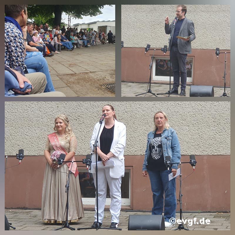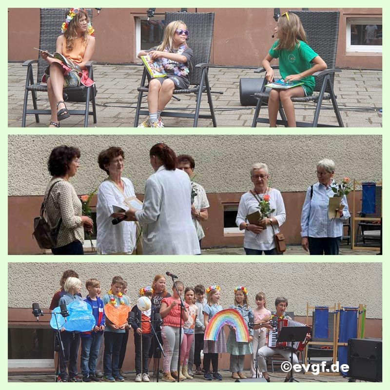Dabei erklangen die ersten Töne des neuen Liedes zur aktuellen Jahreslosung und aus allen Ecken strömten die Kinder und Erwachsenen heran, um sich aufzustellen und gemeinsam in das Lied einzustimmen. Im Anschluss an diese Eröffnung erhielt Pfarrer Klaas das Wort, der mit einer kleinen Andacht die Jahreslosung noch einmal aufgriff und dabei das Märchen vom kleinen Prinzen zitierte. Die Klasse 4 führte dann durch ein buntes Programm, bei welchem auch namenhafte Gäste wie die Forster Bürgermeisterin Frau Taubenek und die amtierende Rosenkönigin Stefanie III begrüßt werden durften. Neben Liedern, Sketchen und einem Showtanz durfte der Dank aber auch nicht fehlen. Vor allen an die vielen Helfer, die in unserer Schule an den unterschiedlichsten Stellen engagiert mitwirken.