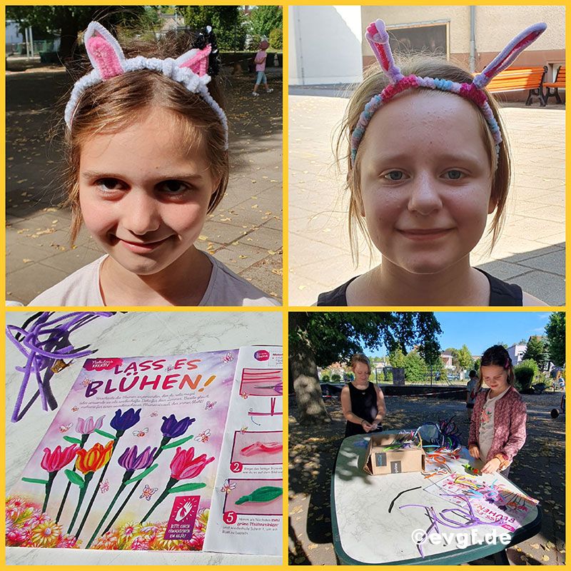 Es wurde geschmückt, gesäubert, Klassen- und Horträume vorbereitet und natürlich auch gespielt und erforscht. Die Kinder beschäftigten sich nochmals mit der Murmelmalerei, wir stellten Eis in verschiedenen Geschmacksrichtungen her und waren kreativ mit Pfeifenreinigern. Kimberly aus Klasse 4 begleitete selbstständig dieses Angebot. Es entstanden tolle Blumen, Haarreifen und vieles mehr. Nun ist die Ferienzeit schon wieder vorbei und wir starteten am Montag mit Freude und Elan in das neue Schuljahr.