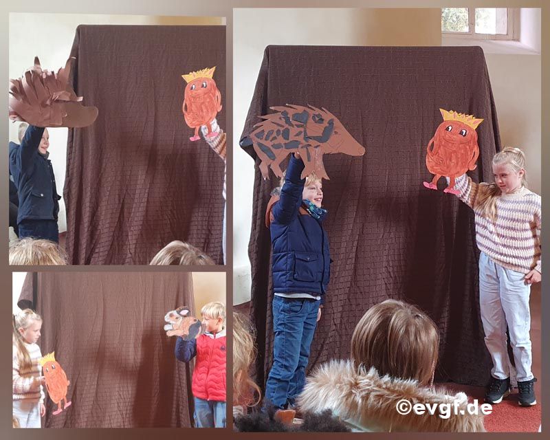 In einem kleinen Anspiel zeigten die Kinder der Klassen eins bis sechs, wie der Kartoffelkönig sich davor zu retten versucht, gegessen zu werden, und schließlich das Weite sucht – bis er auf zwei hungernde Kinder trifft, bei denen er sich schließlich gern in den Korb legt.