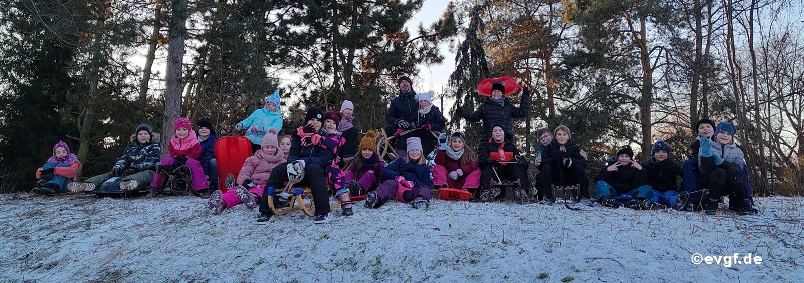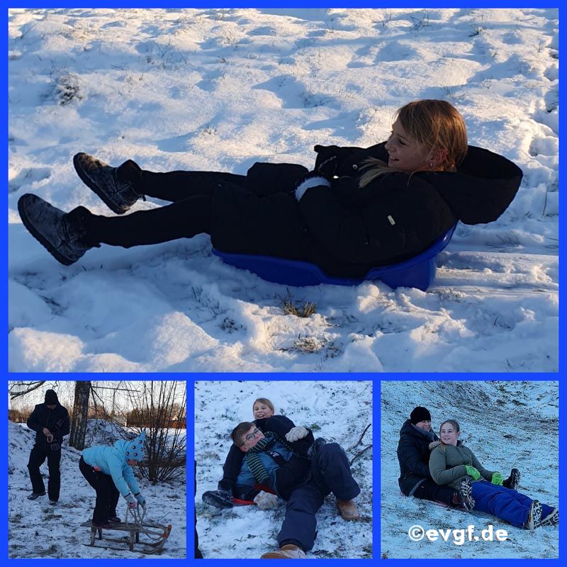 Dort hatten wir jede Menge Spaß, rutschten und rodelten vorwärts und rückwärts, manchmal auch seitwärts 😉. Eine vorhandene kleine Schanze brachte zusätzlich viel Spaß und das unangetastete Spielfeld lud ein, ein paar "Schneeengel" zu machen. Am Ende unseres Gruppennachmittages hatten viele Kinder hübsche rote Wangen und wir gingen zufrieden zurück in die Schule.