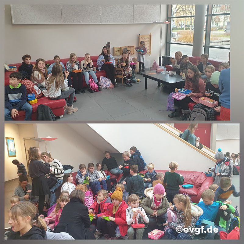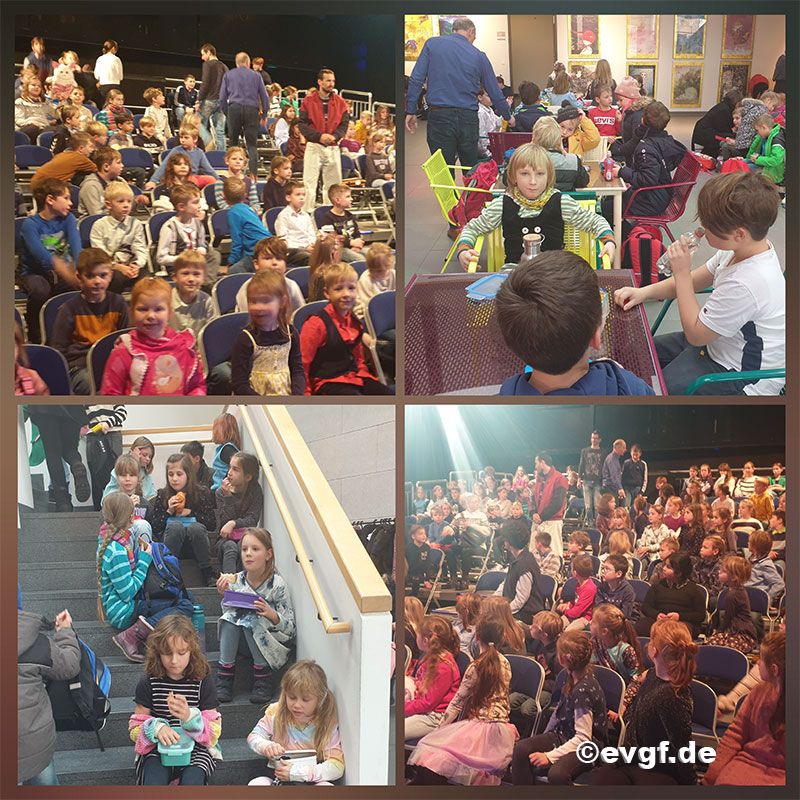 Im Anschluss an das Stück gab es noch eine kurze Möglichkeit sich zu stärken. Dabei zeigten sich auch die Schauspieler bei den Kindern und ganz aktiv standen plötzlich Profis und Schüler im Foyer und übten sich in Bodypercussions.