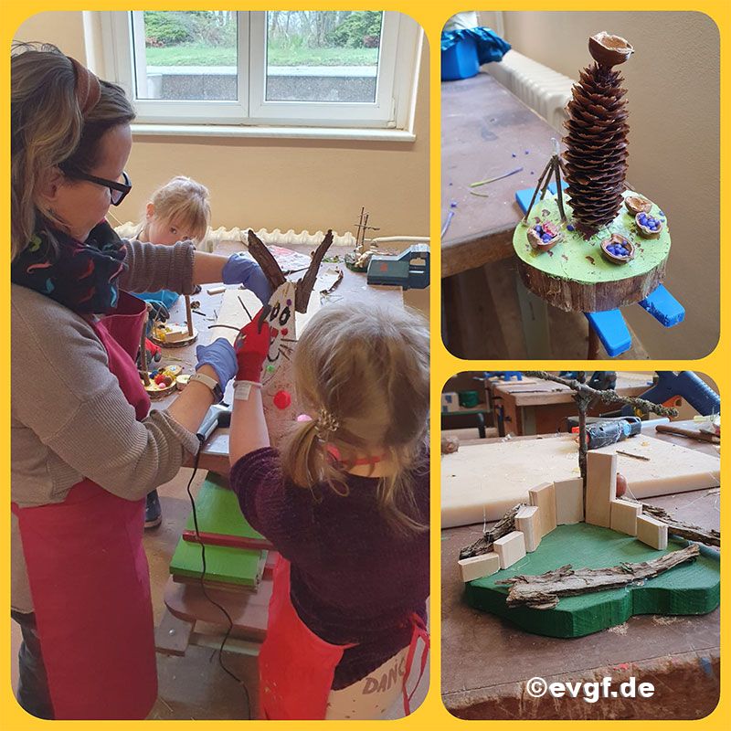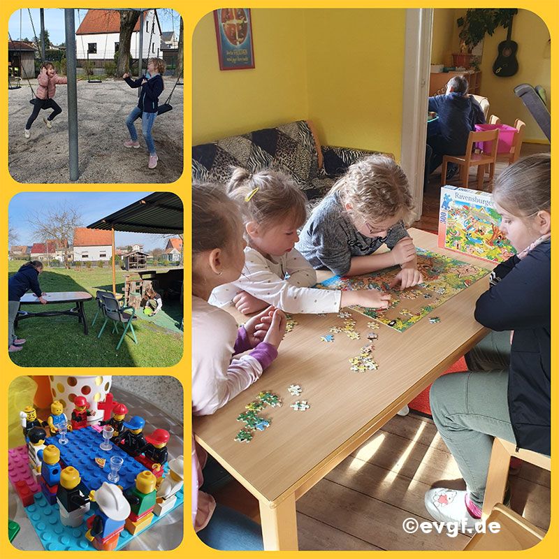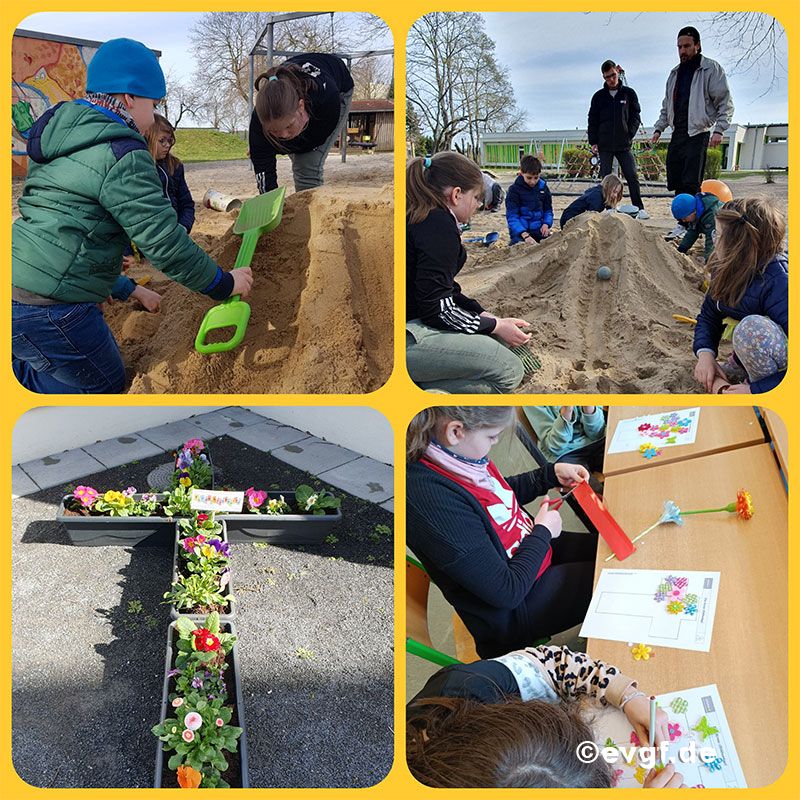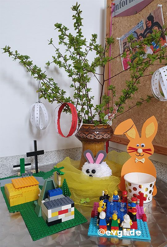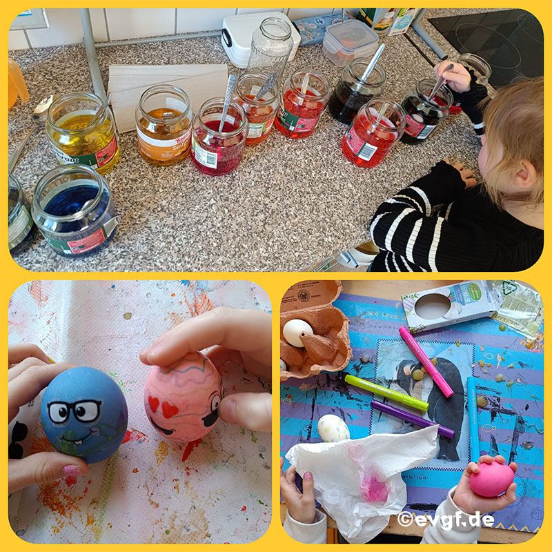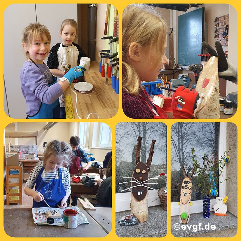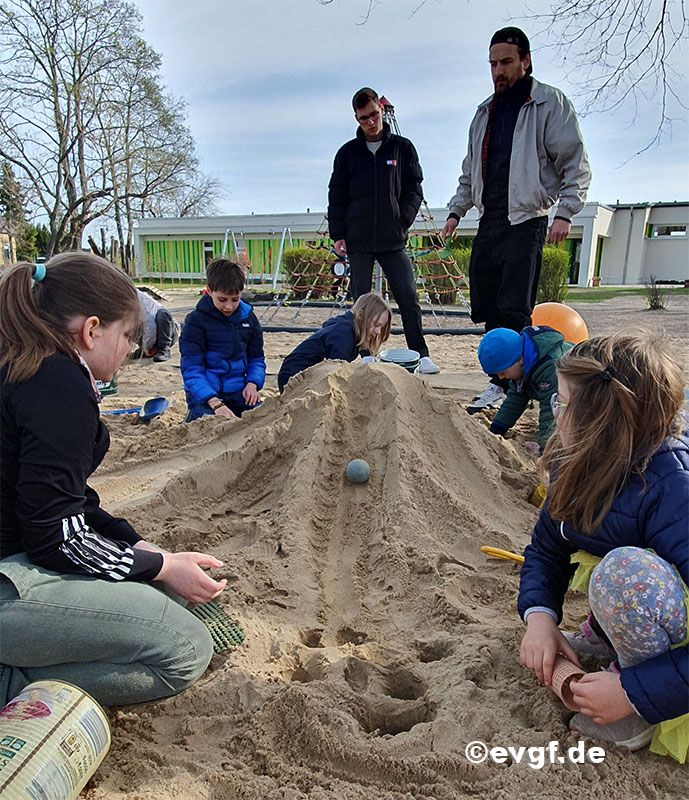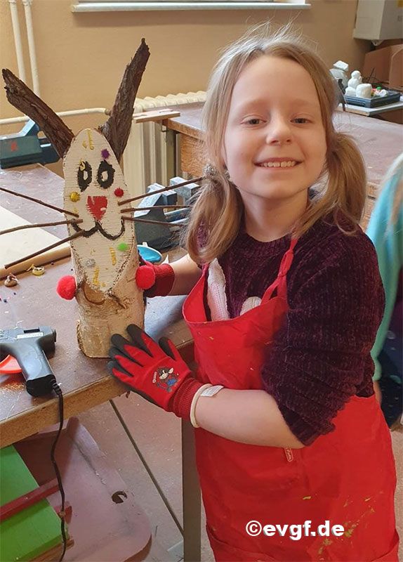 Die Ferienkinder konnten in einer Osterwerkstatt das Thema "OSTERN" künstlerisch bearbeiten. Aus verschiedenen Naturmaterialien entstanden kreative Ostergärten, Osterhasen verschiedener Nationalität oder Holzscheiben, die bemalt wurden. Wir befreiten unser Sandspielzeug, um das traditionelle Spiel "Waleien" umzusetzen und anschließend richtige große Sandmurmelbahnen entstehen zu lassen. Die beliebte Lounge bekam einen Frühjahrsputz und die Kinder färbten und bemalten ihre Eier nach Herzenslust. Aus Legosteinen und in echt stellten wir, gemeinsam mit Frau Thümmel, das letzte Abendmahl nach. Wie durch ein Wunder nahmen zwölf Kinder (Jünger) daran teil. Nach einem Kinofilm gingen wir entspannt ins lange Osterwochenende.