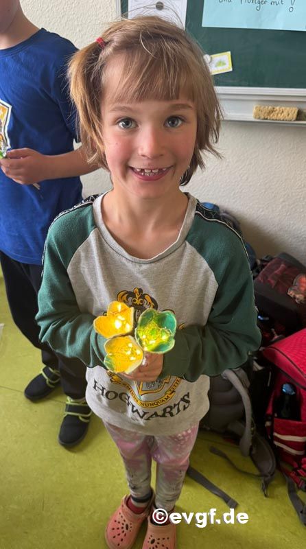 Zum Schluss haben die Kinder grünen Biegeplüsch um den Stängel gewickelt und ein Blatt aus demselben Material mit eingebunden. Als Frühlingsbasteln getarnt war es eine Überraschung zum Muttertag.