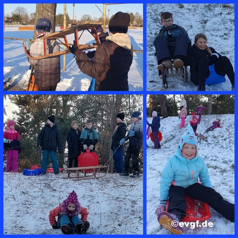 Dort hatten wir jede Menge Spaß, rutschten und rodelten vorwärts und rückwärts, manchmal auch seitwärts 😉. Eine vorhandene kleine Schanze brachte zusätzlich viel Spaß und das unangetastete Spielfeld lud ein, ein paar "Schneeengel" zu machen. Am Ende unseres Gruppennachmittages hatten viele Kinder hübsche rote Wangen und wir gingen zufrieden zurück in die Schule.